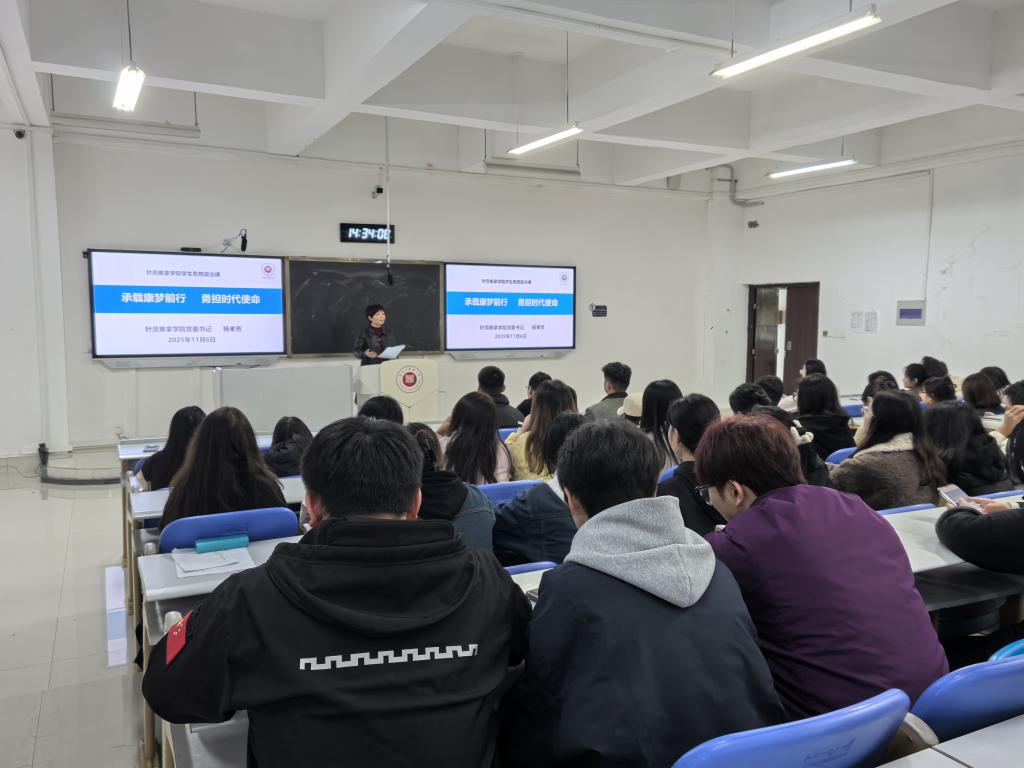 2025年11月6日,yl8cc永利官网党委书记杨孝芳以“承载康梦前行,勇担时代使命”为主题,为2023级康复治疗学专升本班全体学生带来了一场内涵丰富、思想深刻的学生思想政治课。