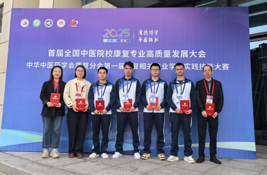 2025年11月6日-8日,由中华中医药学会主办,河南中医药大学承办的第一届康复相关专业学生实践技能大赛在河南中医药大学龙子湖校区圆满落幕。我们yl8cc永利官网副院长吴高鑫带队出征,康复医学基础教研室潘莉、唐徐韵担任指导老师,我们2022级康复治疗学和中医康复学专业的杨文建、张雨航、丁昌鑫、谢青玉4名同学组成参赛团队,在来自全国中医药院校的20支参赛队伍中,我们团队凭借扎实的专业技能和出色的临场表现,以全国第6名的优异成绩最终斩获大赛三等奖。
