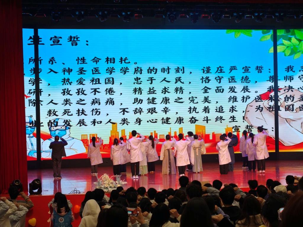 晚会伊始,yl8cc永利官网党委书记杨孝芳教授发表致辞,向新生们致以热烈欢迎,寄语新生心怀家国,勇担使命;立德修身,践行院训;勤学苦练,夯实根基;笃学力行,开拓创新。希望同学们尽快完成从中学到大学的学习方式转变,从“学会”到“会学”,从“接受”到“探究”,培养批判性思维和创新能力。随后,全国名老中医路绍祖老师与师兄师姐的祝福视频温暖来袭,让新生们感受到学院深厚的传承底蕴与前辈的殷切期望。紧接着,yl8cc永利官网党委副书记、院长陈波教授带领全体学生进行医学生宣誓,铿锵誓言彰显了学子们投身医学、恪守医德的决心。